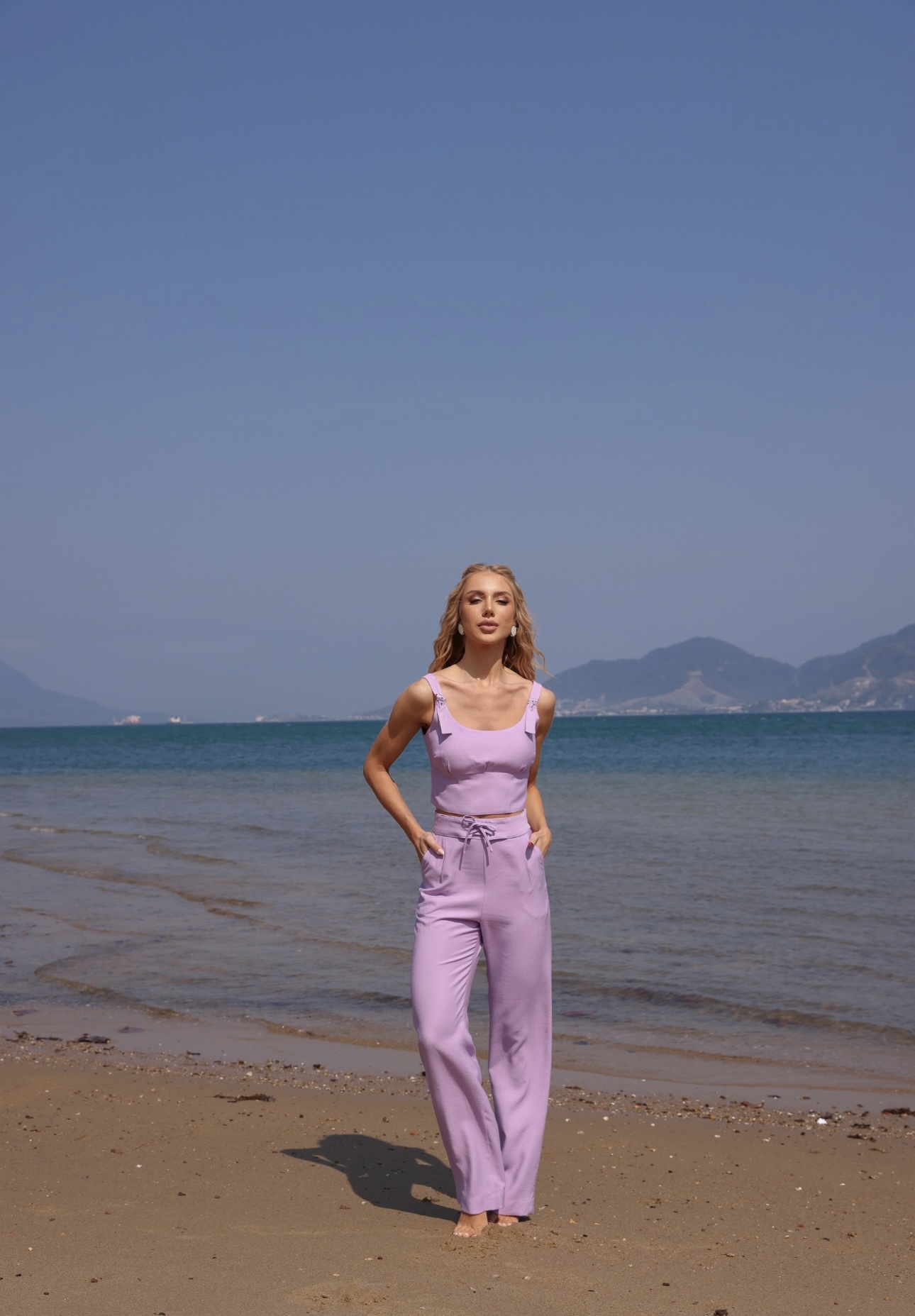CALÇA EM TECIDO CREPE, ZIPER LATERAL E DETALHE EM CORDÃO FRONTAL.