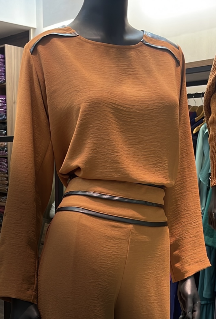 TECIDO:CREPE DETALHE EM COURO ECO.